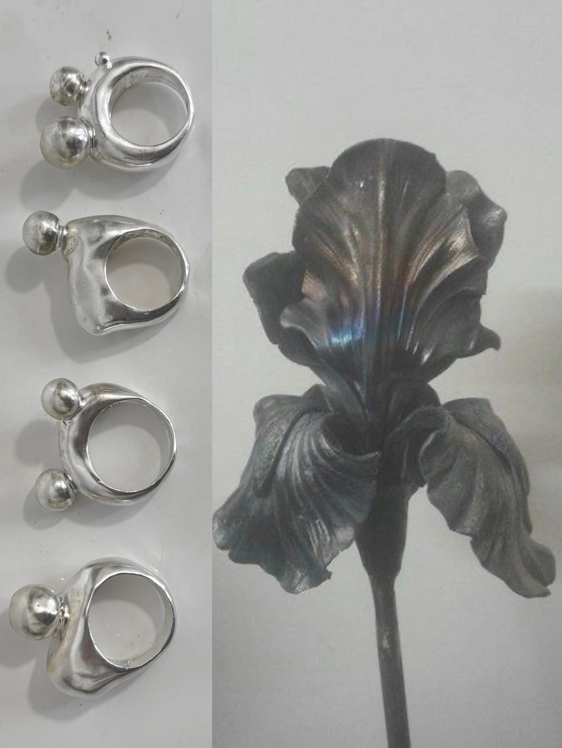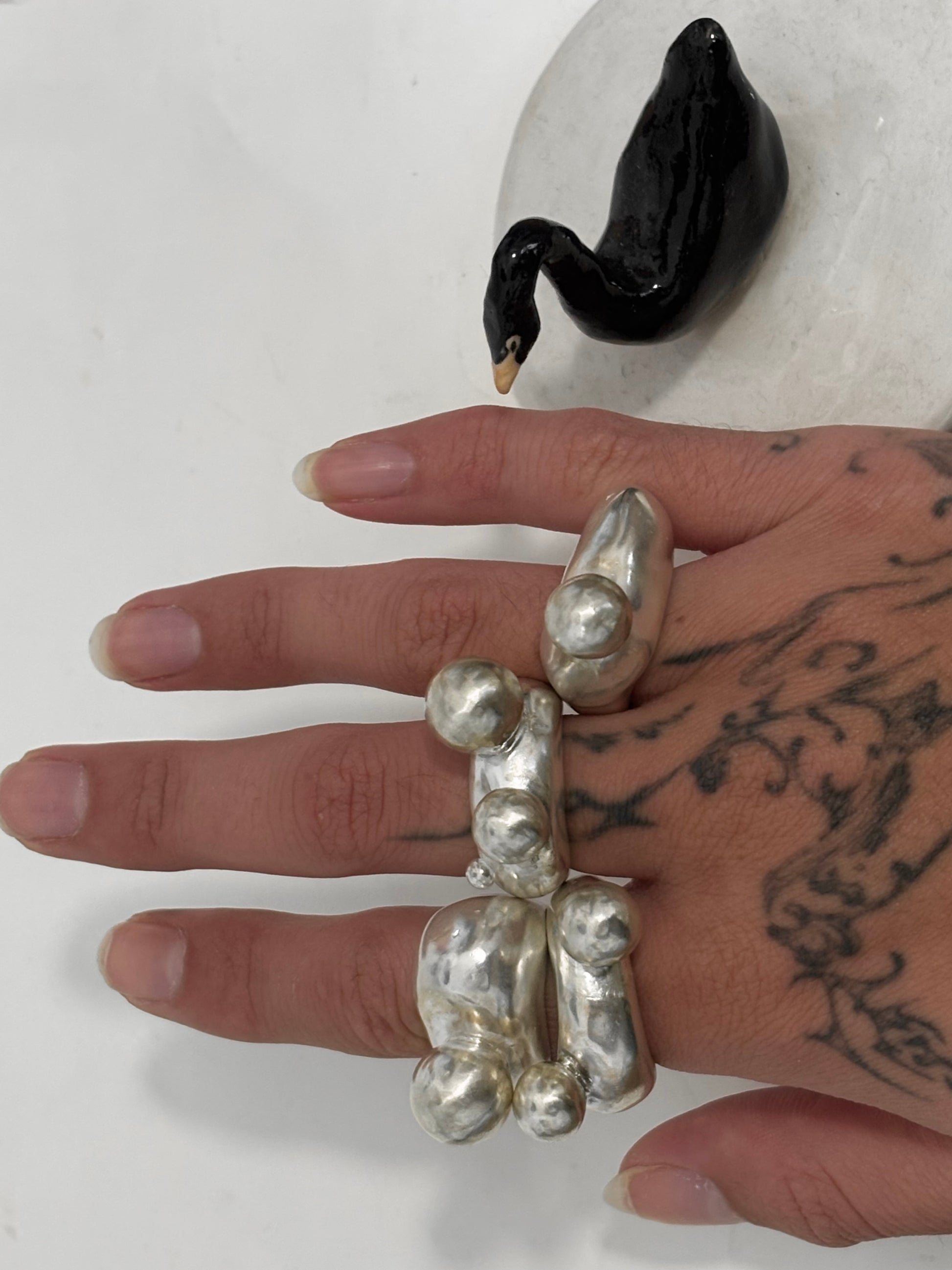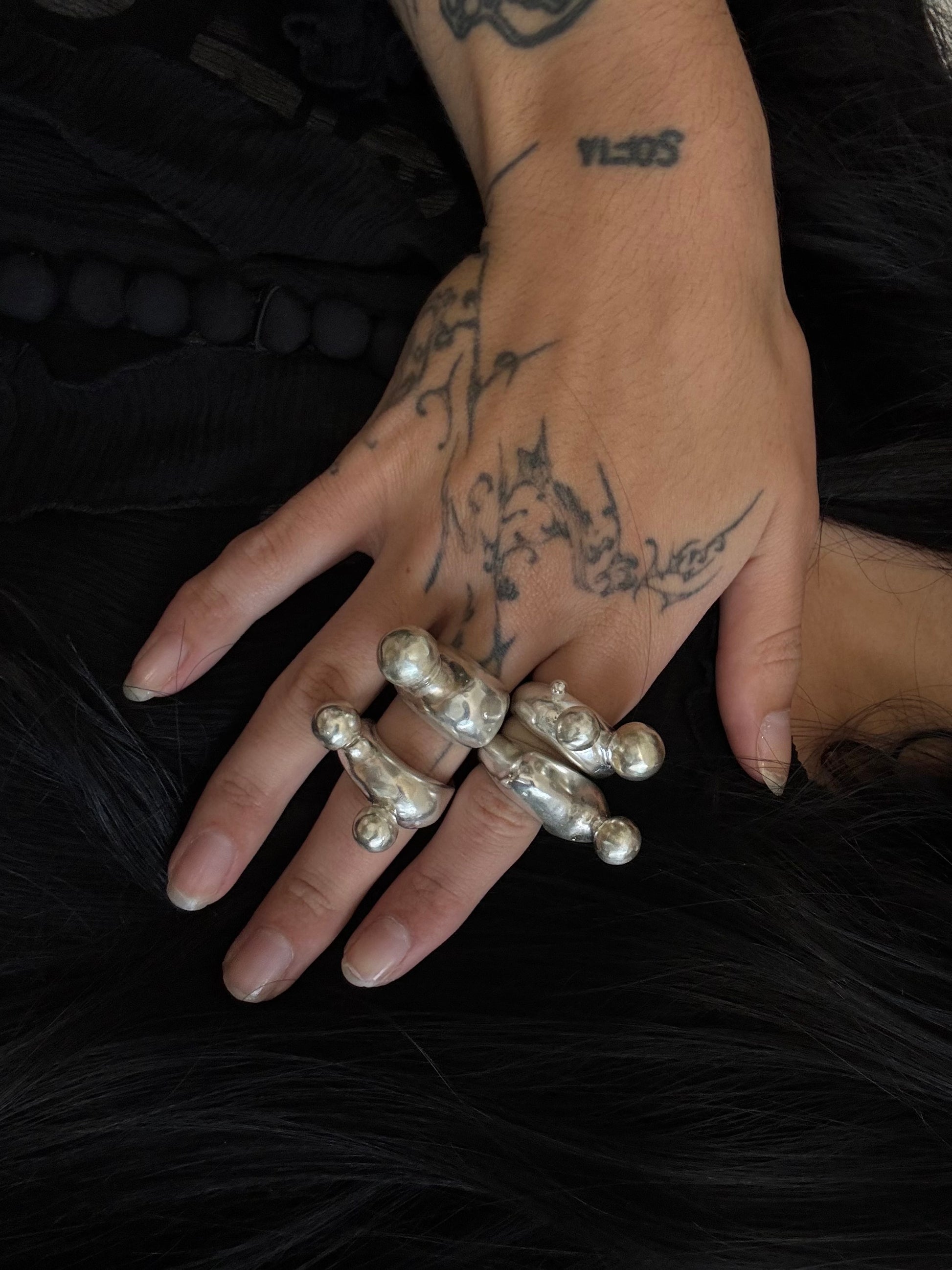 the entire ring is carved by hand and empty inside which actually make it super light and confortable to wear same as the bubbles who are made from metals sheet and are completely empty inside.