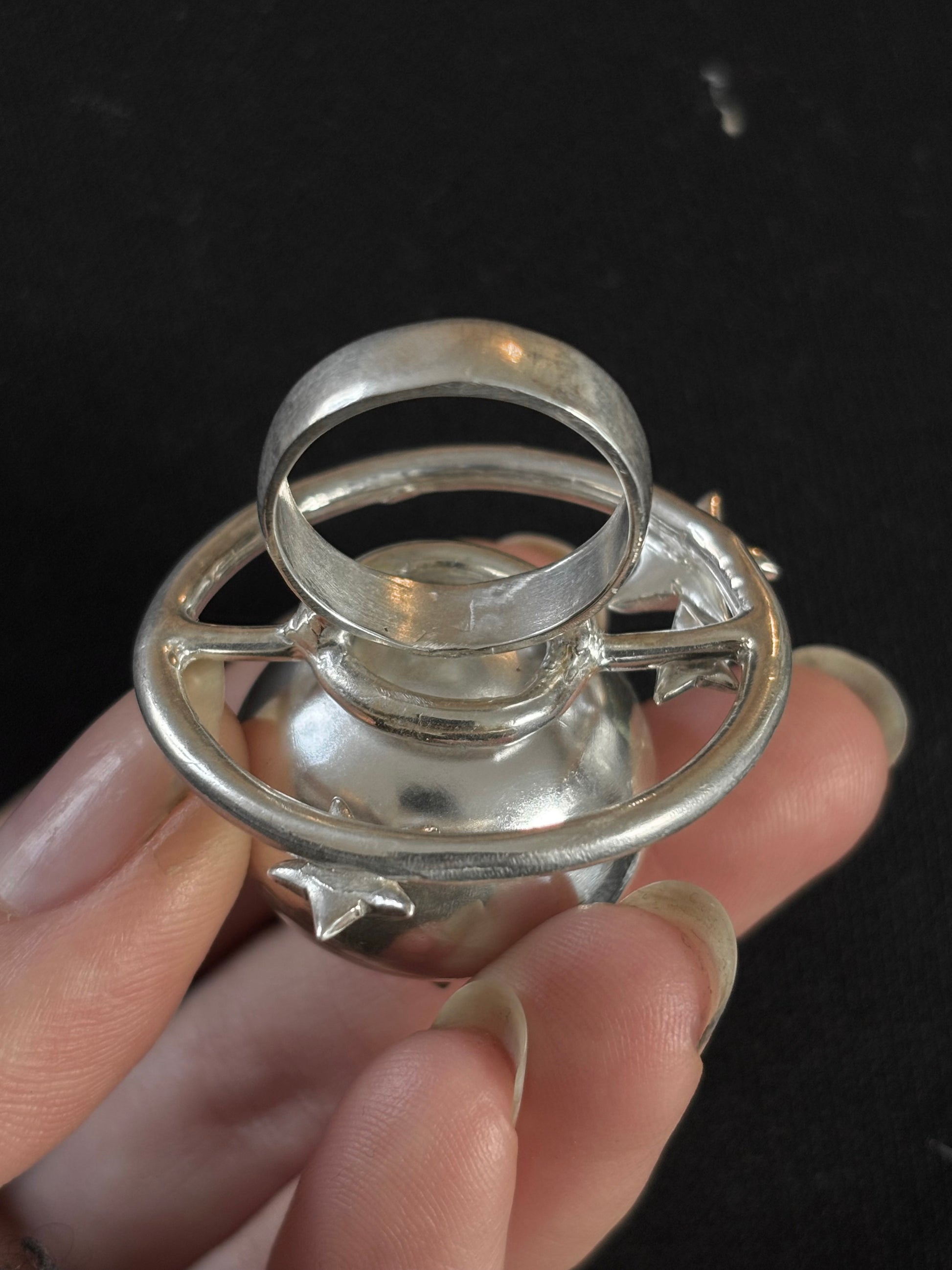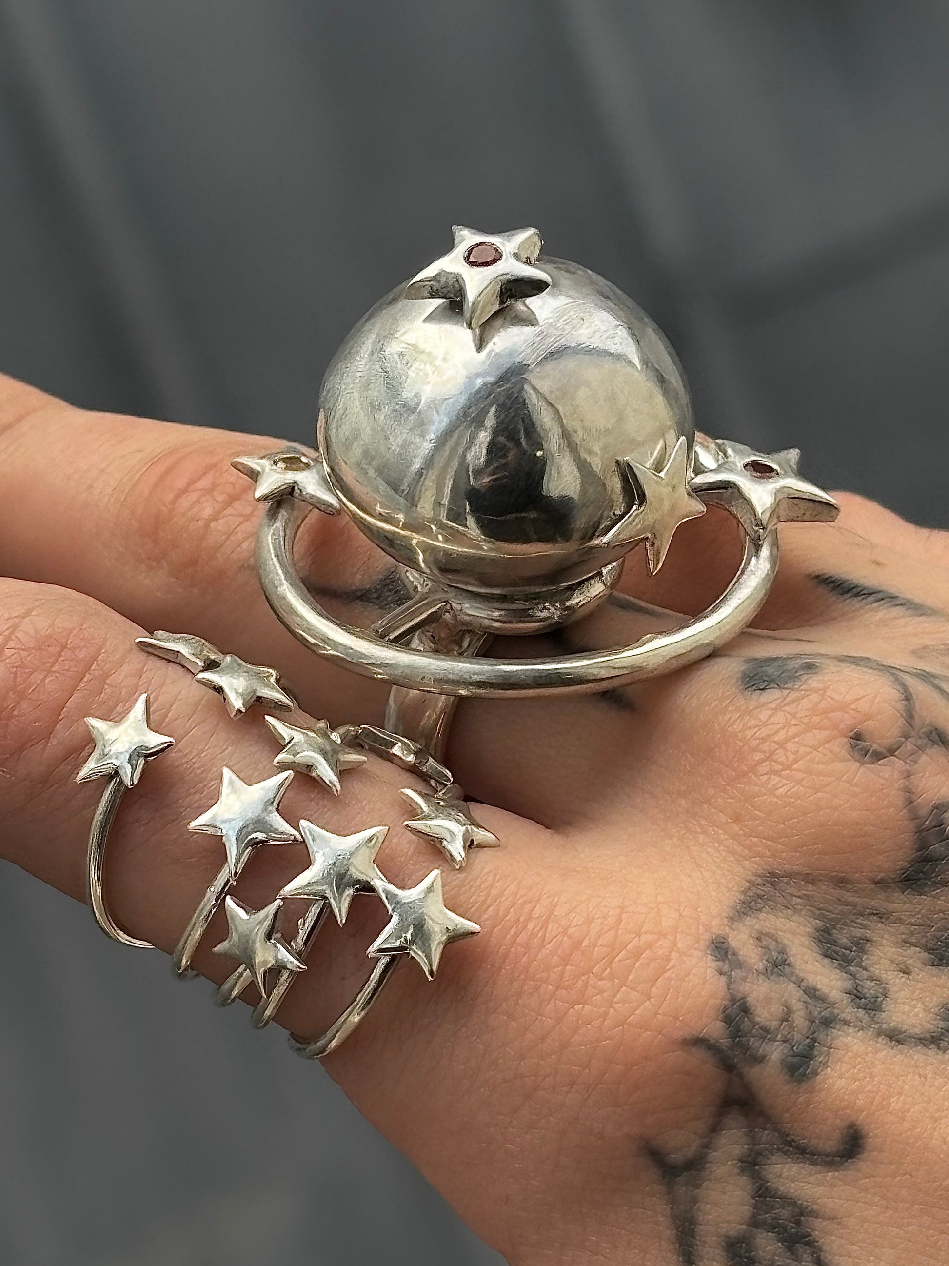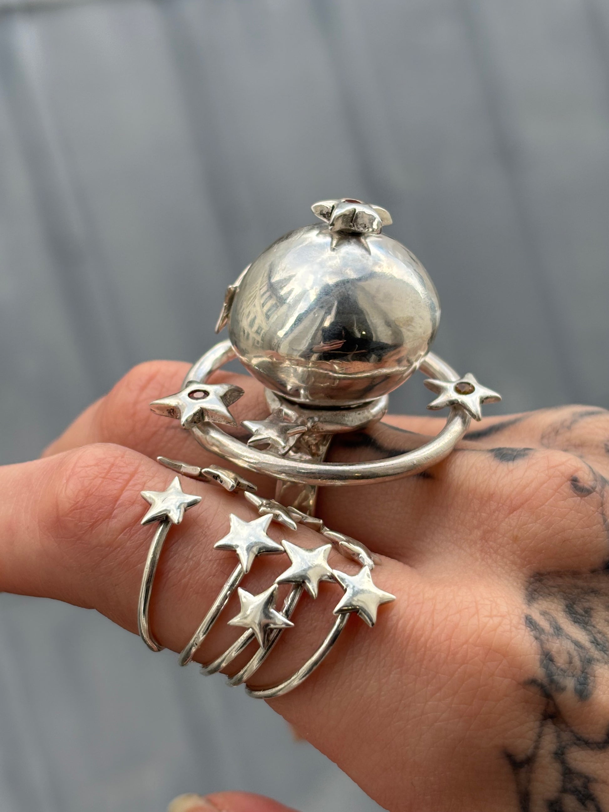 The sphere is made from really fine silver sheets and is completely empty inside, which actually make it super light and confortable to wear.