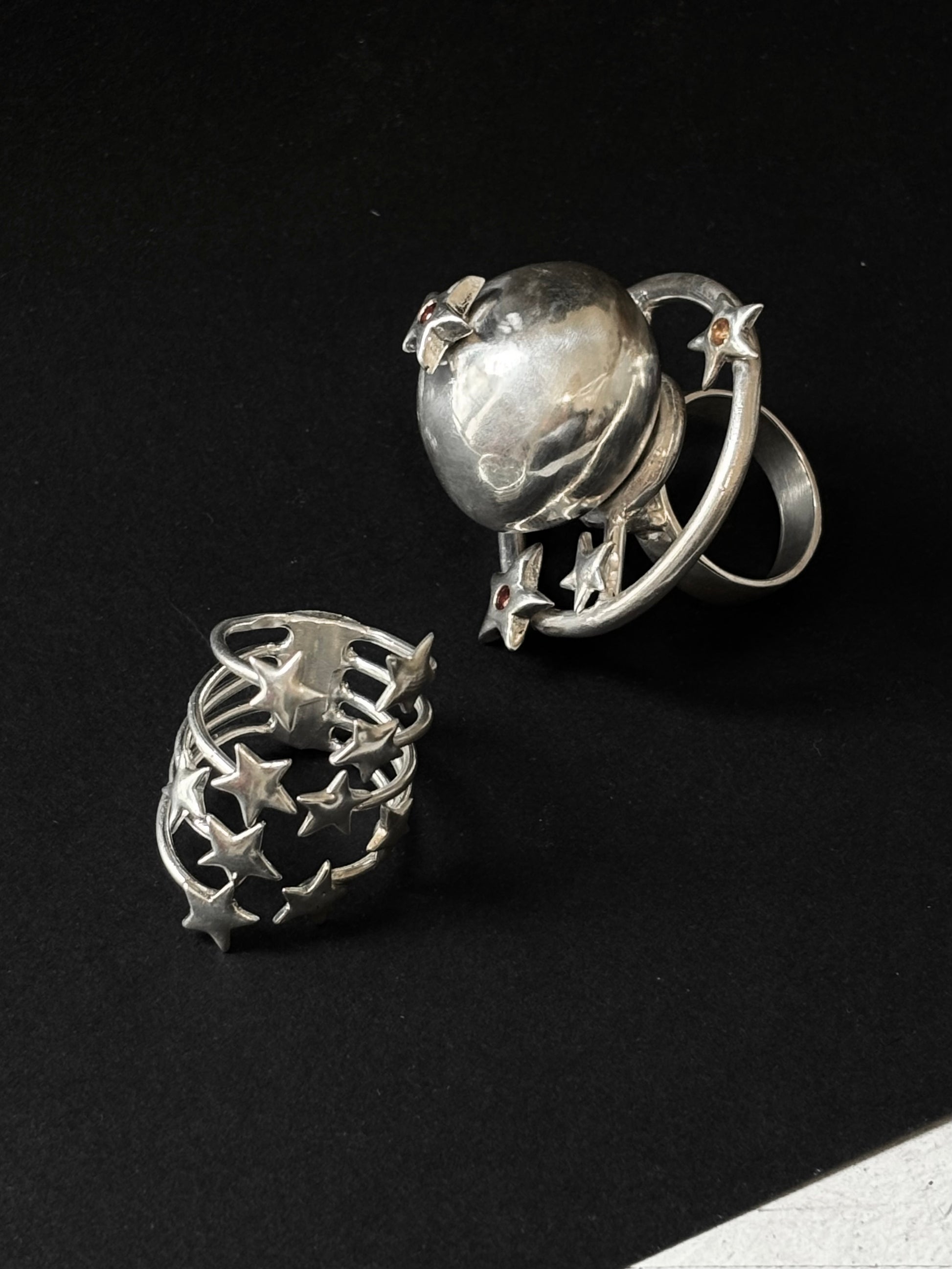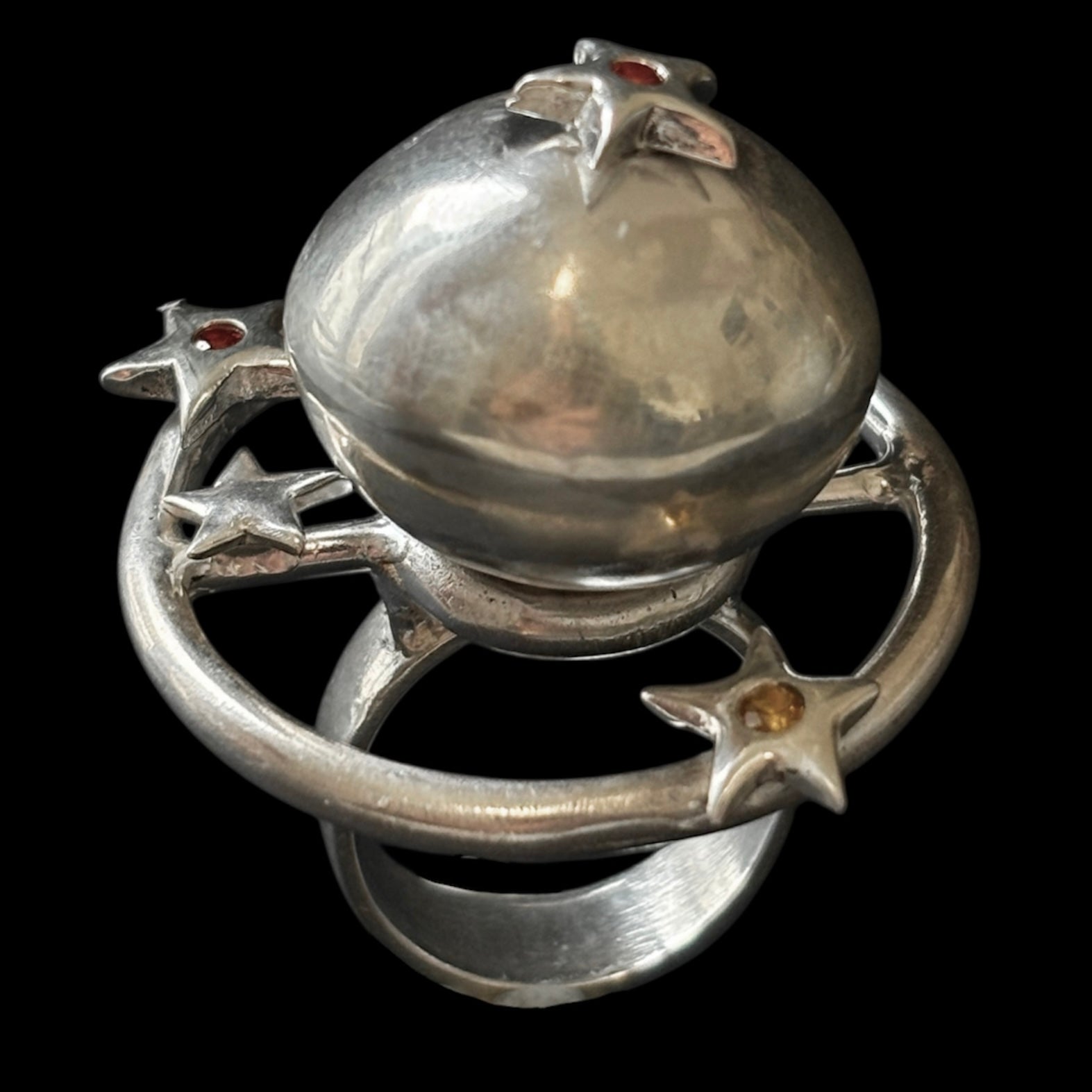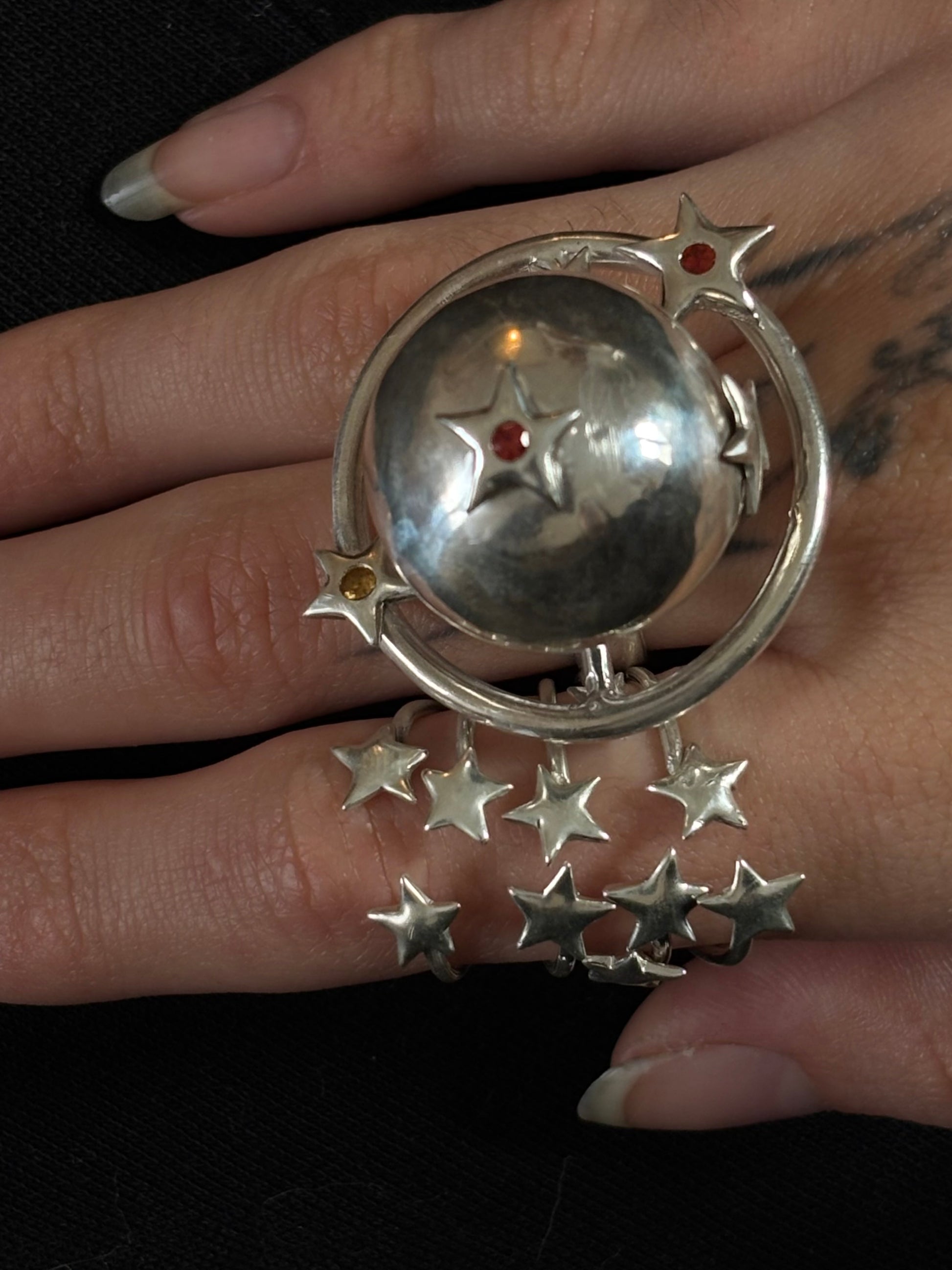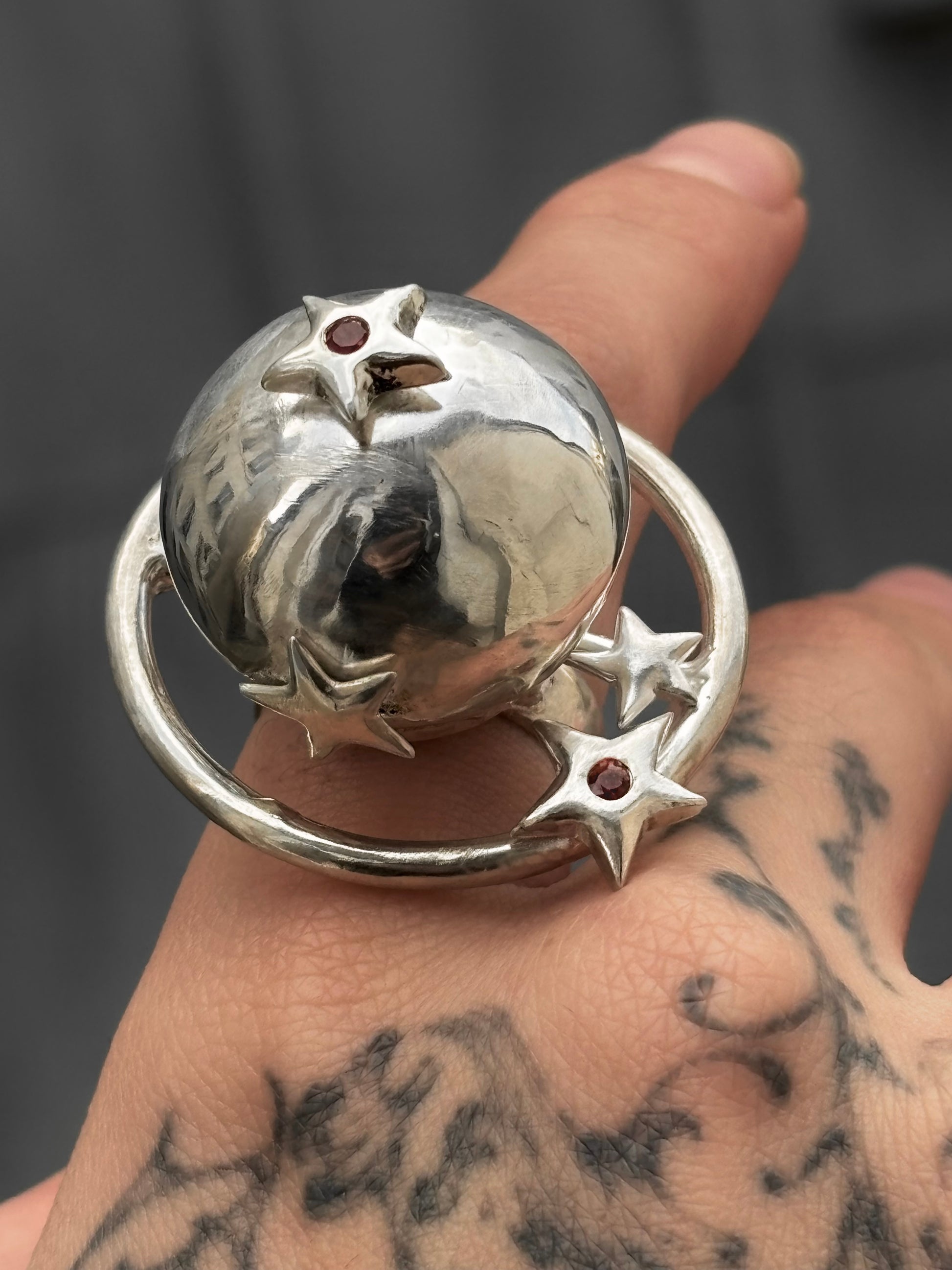 The sphere is made from really fine silver sheets and is completely empty inside, which actually make it super light and confortable to wear.