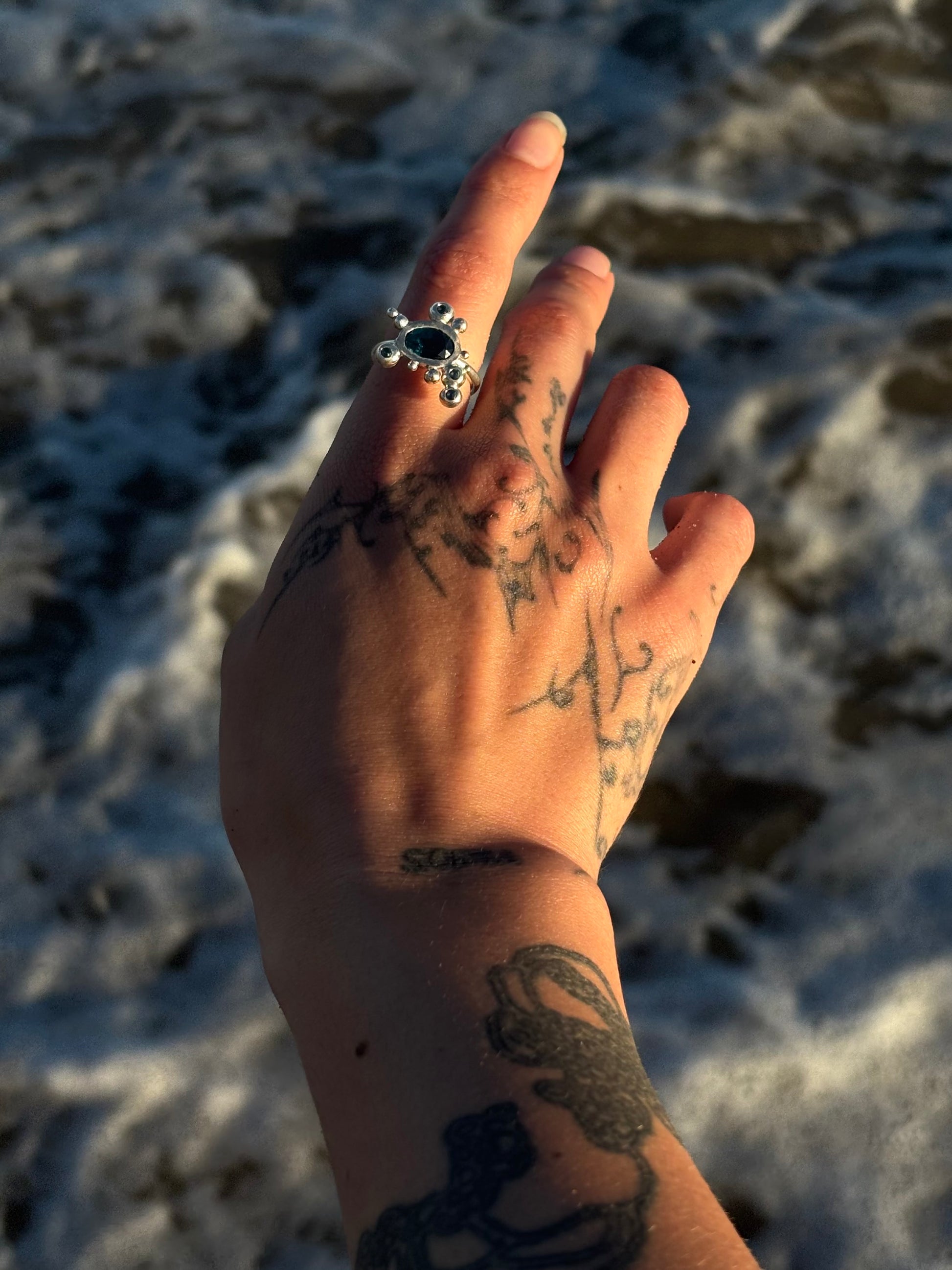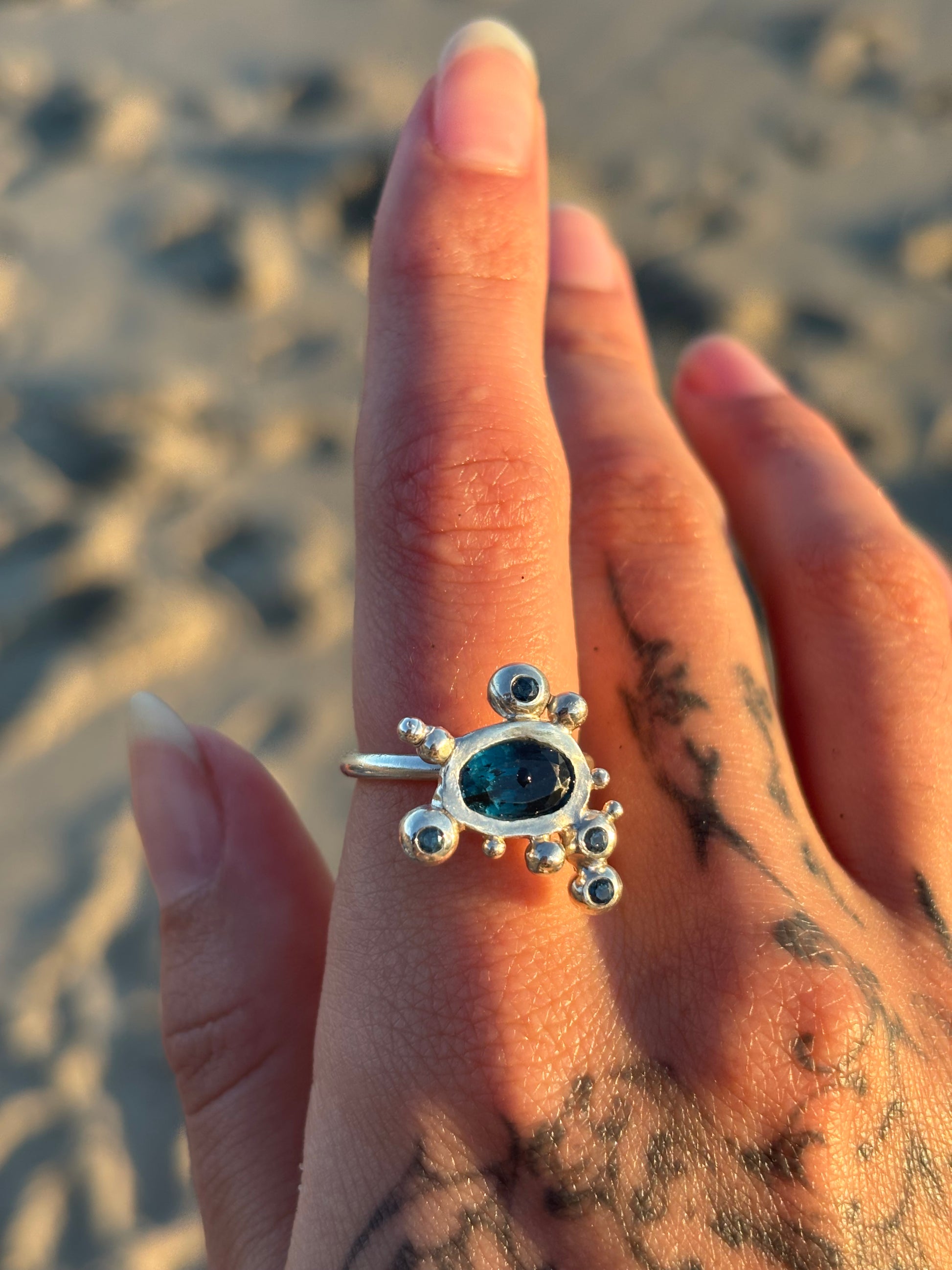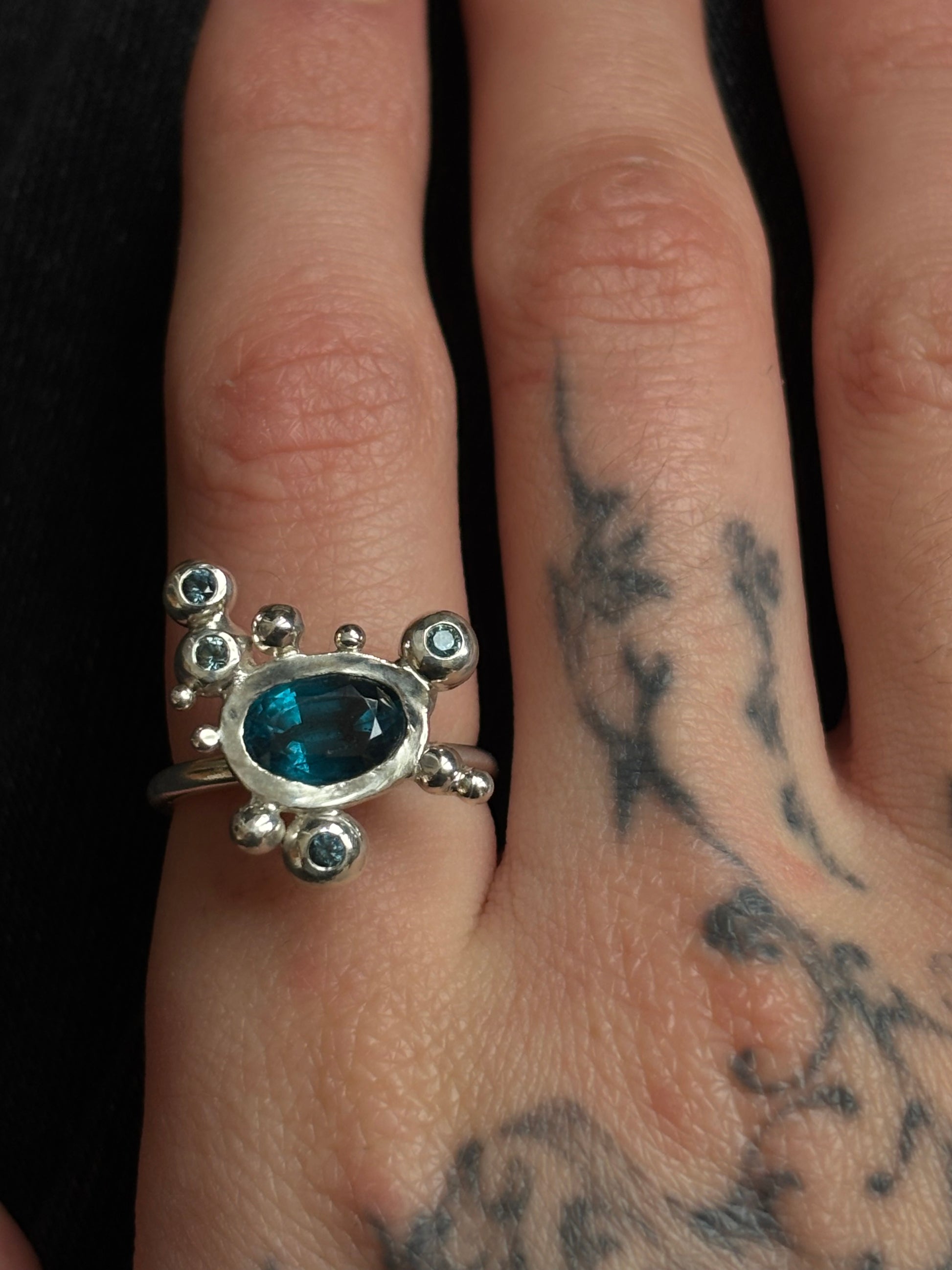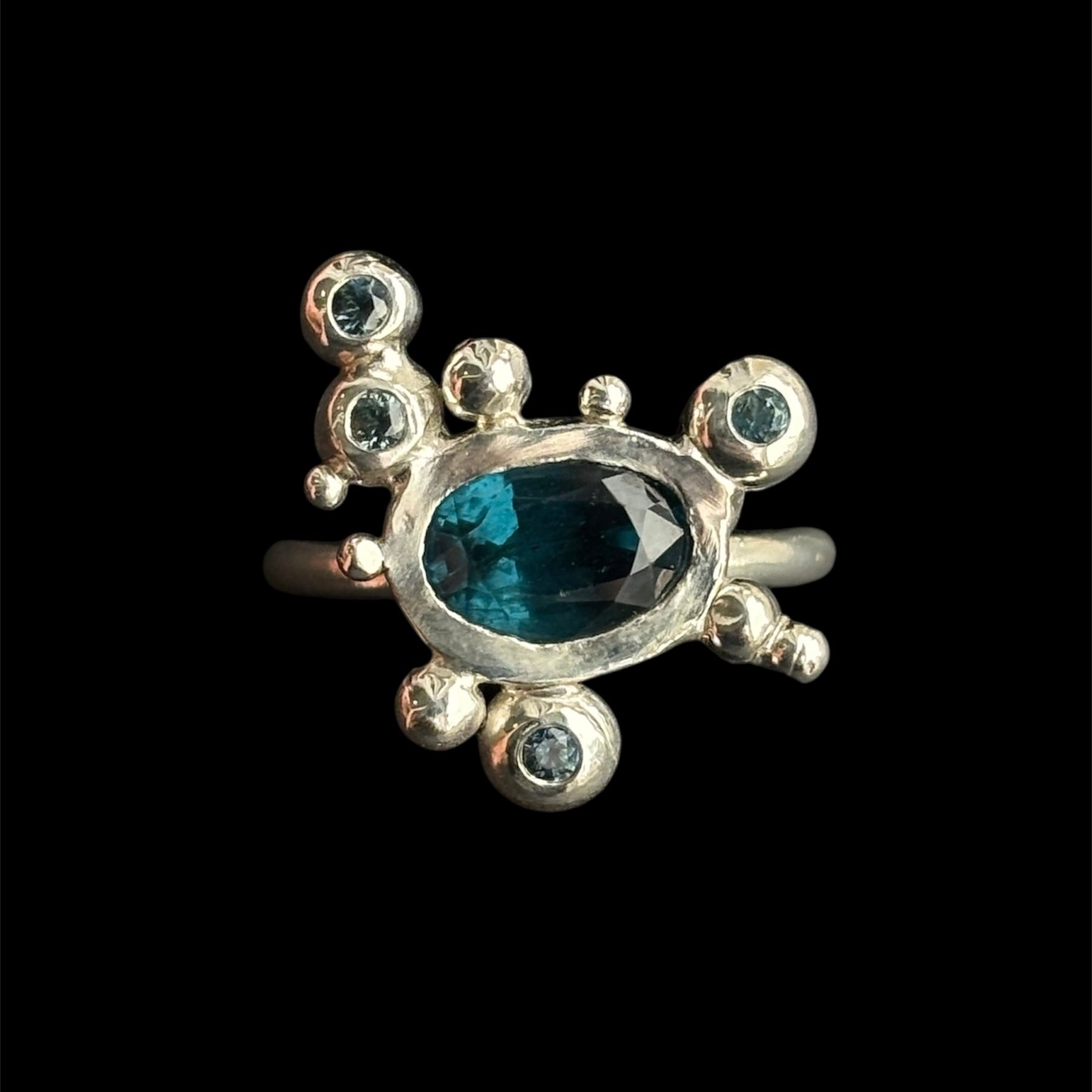 Sterling silver ring sculpted by hand with set in the center a deep blue Disthene and four little teal tourmalines on the sides bubbles