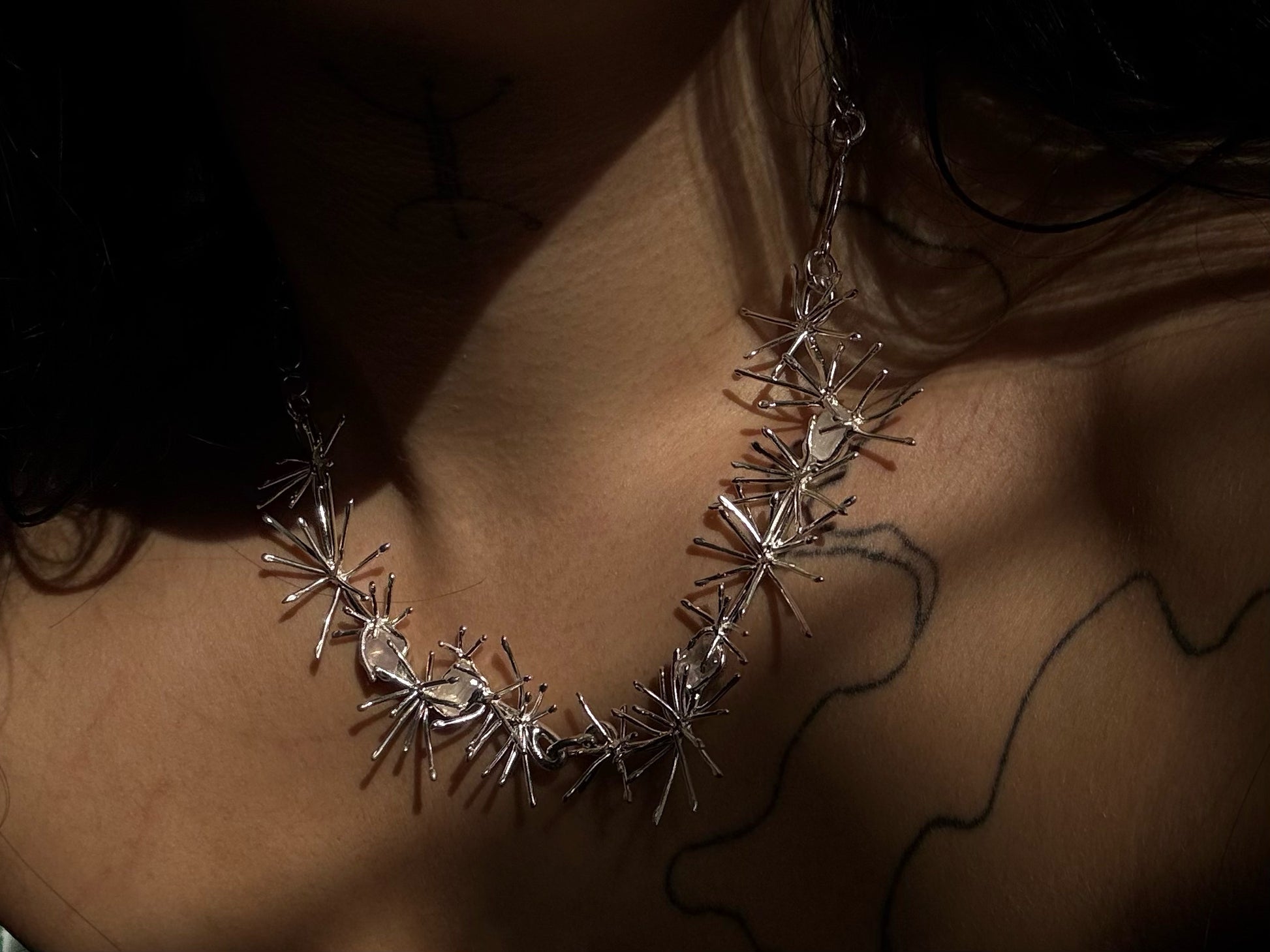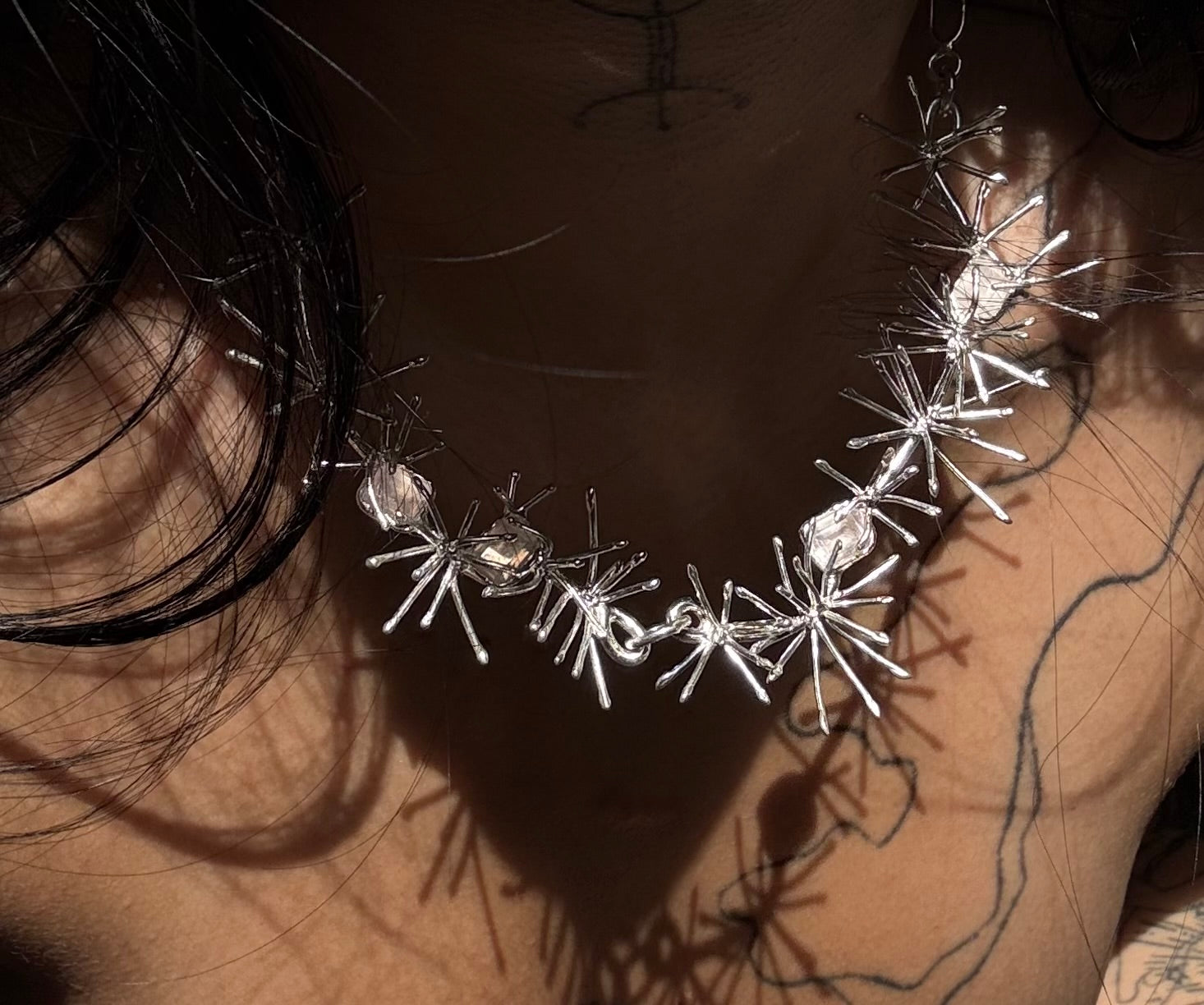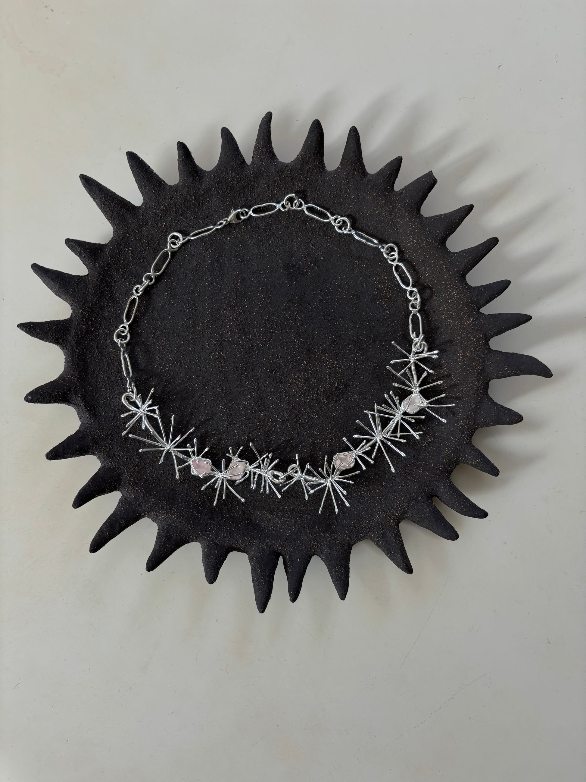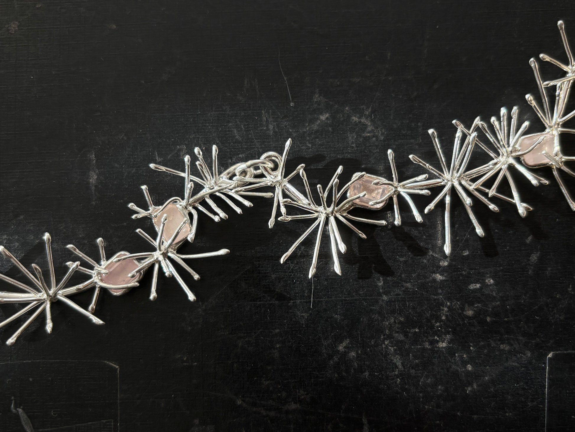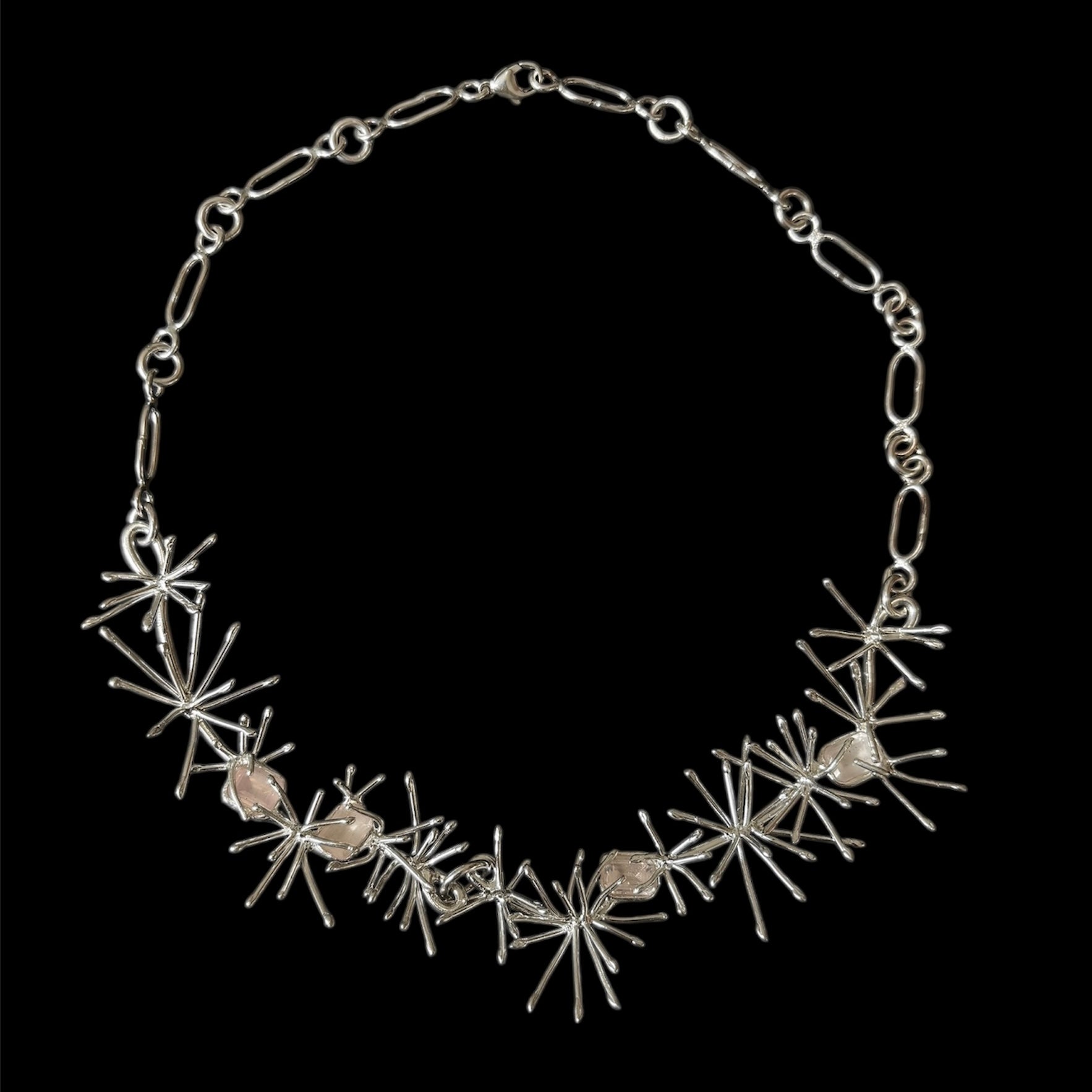 Necklace made from recycled sterling silver and set with four emerald cut pink quartz’s